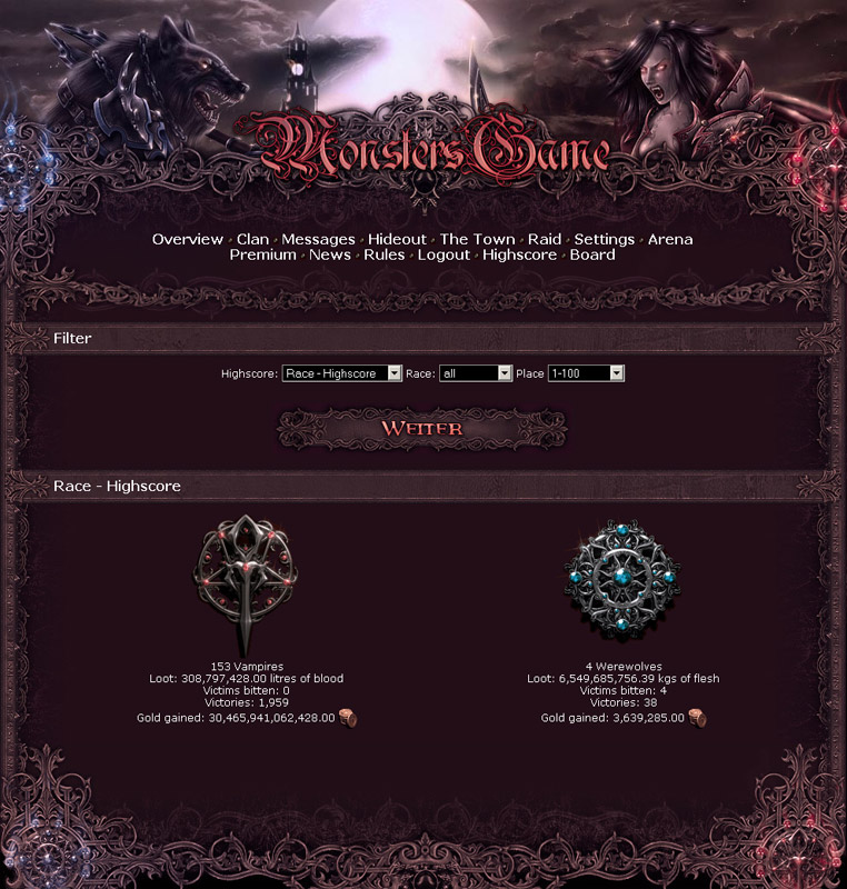 Appena registrato vi ritroverete nella pagina di status del vostro personaggio GDR. Qui potrete trovare importanti informazioni riguardo il vostro personaggio e le vostre vittime del link del morso, con il quale sarete in grado di trovare vampiri in posti remoti di internet, sistemando il link in modo appropriato. Per esempio, puoi spedire il link ai tuoi amici, metterlo nella tua home page, o usarlo come firma in forums. Se una vittima non sospettosa cliccherà, potrete morderla e ricevere 1-3 litri di sangue (se siete vampiri) o 1-3 chilogrammi di carne (se siete lycan). Inoltre la stessa quantità di oro verrà aggiunta al vostro account di gioco. Se la vostra vittima si registrerà a Monsters Game, voi avrete creato un nuovo vampiro/lycan, e riceverete il 25% del bottino che lui guadagnerà con le sue vittime su internet! Quando il personaggio che voi avrete creato raggiungerà il livello 3 riceverete 50 monete e 1 punto esperienza! Potete investire il vostro oro nell'allenamento del vostro personaggio per l'accrescimento dei suoi attributi o comprare ed evolvere il vostro Nascondiglio per proteggervi dagli attacchi della razza avversaria.