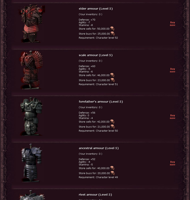 Guardiani Una volta che hai raggiunto il livello 5 puoi acquistare per il tuo personaggio il primo dei guardiani. Vi sono più di 20 differenti guardiani in tutto, ognuno dei quali può essere allenato per migliorare i suoi valori di attacco, difesa e robustezza. Ogni guardiano ha uno specifico valore di partenza per questi tre attributi; per allenare uno di questi attributi, dovrai pagare 1 moneta per il primo punto, 4 per il secondo punto, ecc... Più alto è il costo per comprare un guardiano, più alto sarà il valore iniziale dei suoi attributi. In questo modo, se i valori iniziali del guardiano sono di livello 3, spendendo 1 moneta si porterà tale valore a 4, spendendo 4 monete si porterà quel valore a 5 e cosi via. Analogamente se i valori di base del guardiano sono a 10, allenarlo fino a 11 costerà 1 moneta, portarlo a 12 ne costerà 4. Se hai intenzione di allenare molto il tuo guardiano è una buona idea quella di comprare sempre il miglior guardiano disponibile perchè finirai col risparmiare denaro in futuro quando ogni nuovo livello potrà facilmente costare 10000 monete! Puoi congedare il tuo guardiano in qualunque momento per comprare un altro guardiano; nel farlo riceverai indietro l'intera somma versata per acquistarlo, MA ogni moneta spesa per allenare il guardiano è persa! Gli attributi del tuo guardiano vengono aggiunti a quelli del tuo personaggio ogni qualvolta combatti un nemico, nello stesso modo delle armi e armature, può potenziare i tuoi attributi. Ad ogni modo, il bonus derivato dal guardiano, sarà mostrato in una separata sezione del report di battaglia, mentre invece il bonus derivato dall'arma e/o dall'armatura è direttamente aggiunto ai tuoi valori.