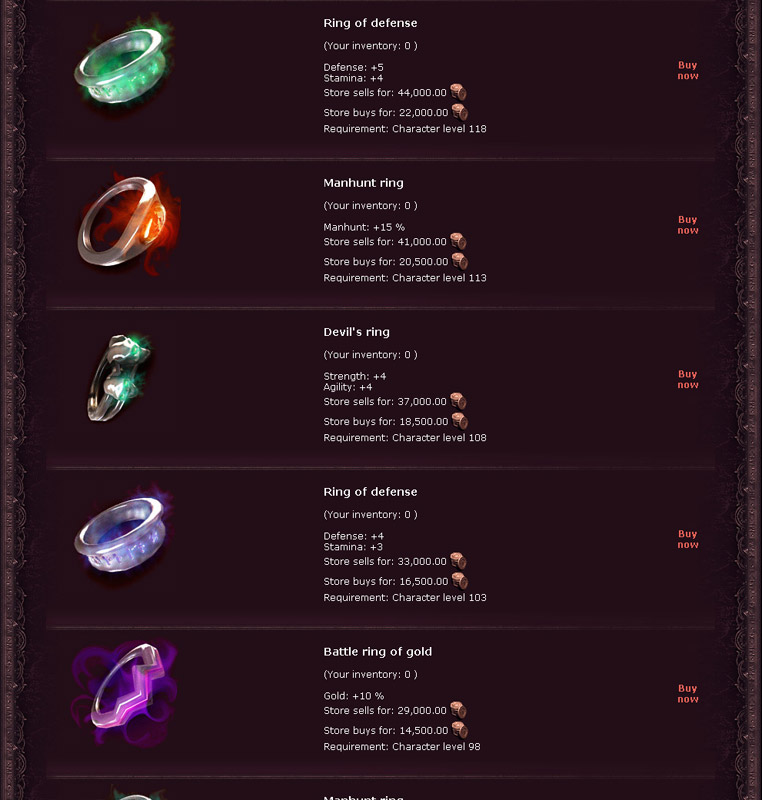 - Ci sono 3 categorie base di anelli: caccia all'uomo, guerra/oro, e anelli che aumentano le statistiche dei vostri pg in battaglia. Solo gli anelli migliori che possedete verranno conteggiati per i bonus per le cacce agli umani e per le guerre/oro e solo uno di questo tipo può essere conteggiato. Gli anelli che aumentano le statistiche durante la battaglia saranno scelti in base al livello; anelli doppi di questo tipo (o anche di altro tipo) NON verranno conteggiati, quindi comprare due anelli di ogni tipo non sarà utile. Se vuoi avere vantaggi da tutti i tipi di anelli compra l'anello migliore per la caccia ll'auomo, per guerra/oro, per il miglioreamento delle statistiche OPPURE il migliore e il secondo migliore della0aumento skill se ti vuoi specializzare in difesa o in attacco.